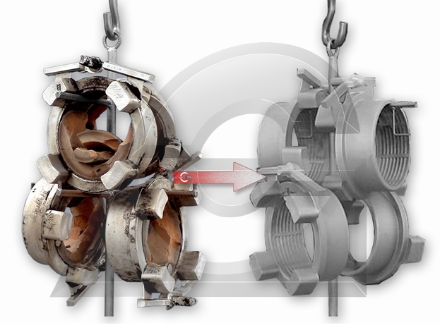 A projecção do jacto da granalha ou abrasivo é efectuada através de uma ou mais turbinas, que pelo seu movimento giroscópico aspiram e lançam a granalha até às peças.